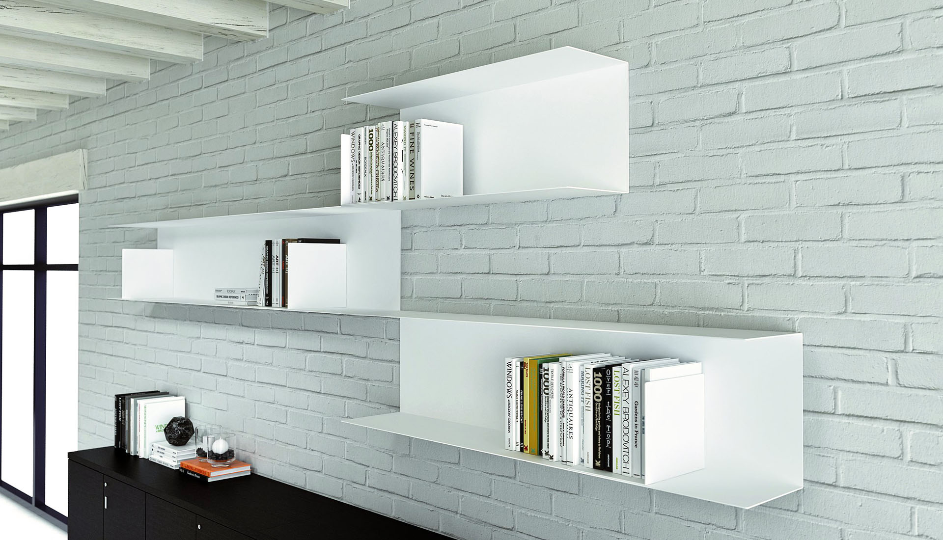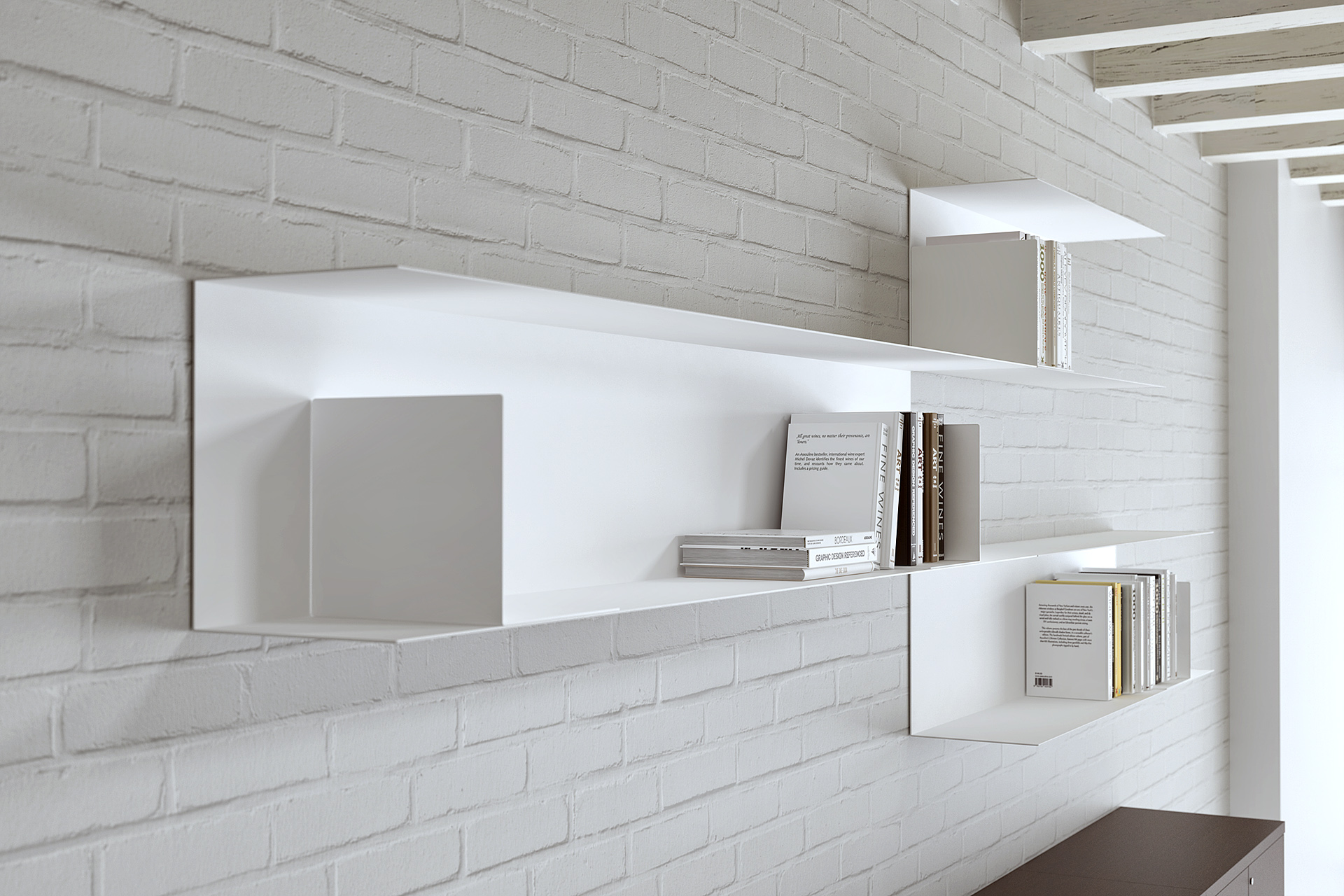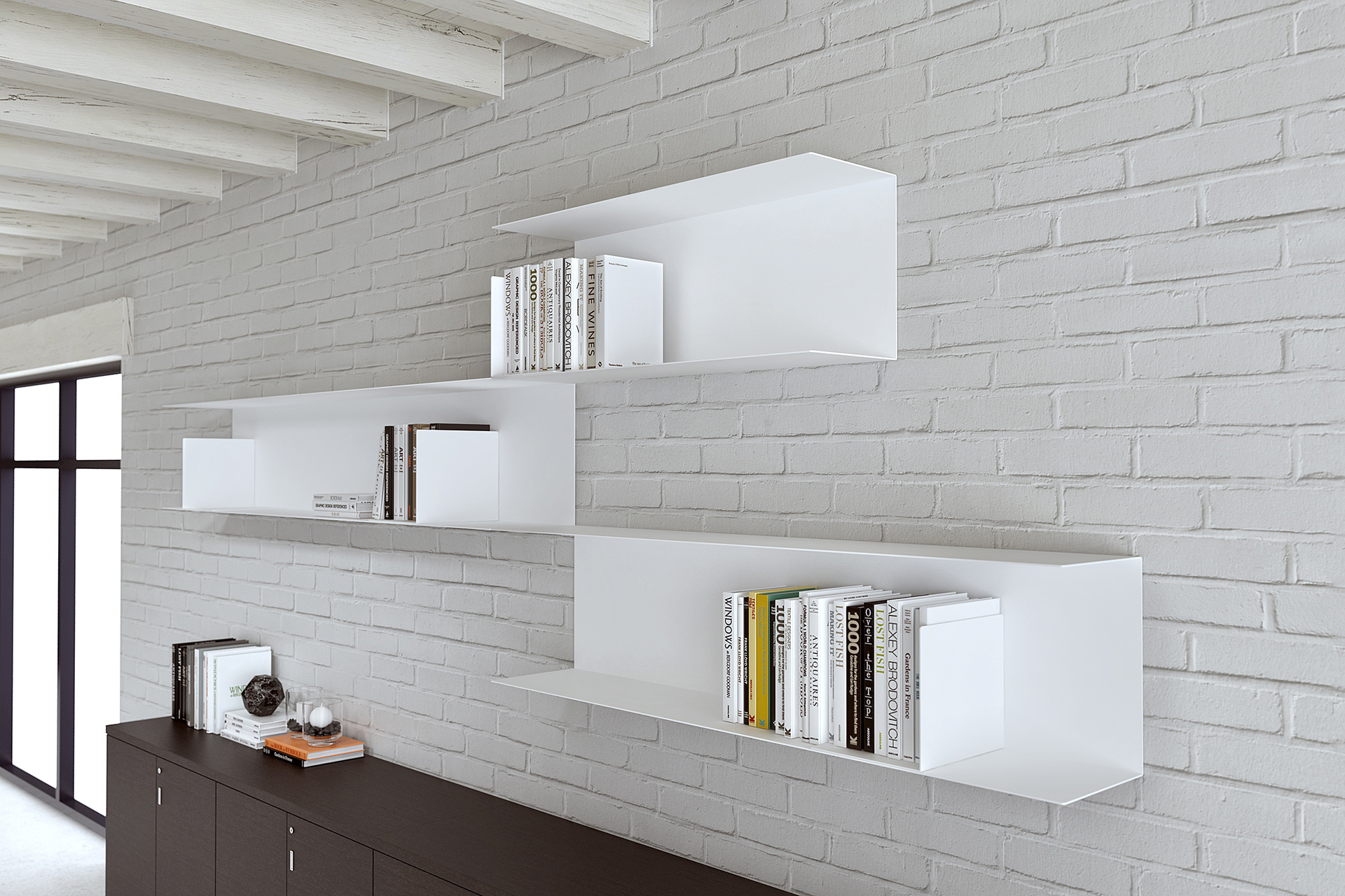 Le système d’étagères Icaro est constitué d’une unique feuille de métal pliée disponible dans toutes les couleurs de finition époxy.