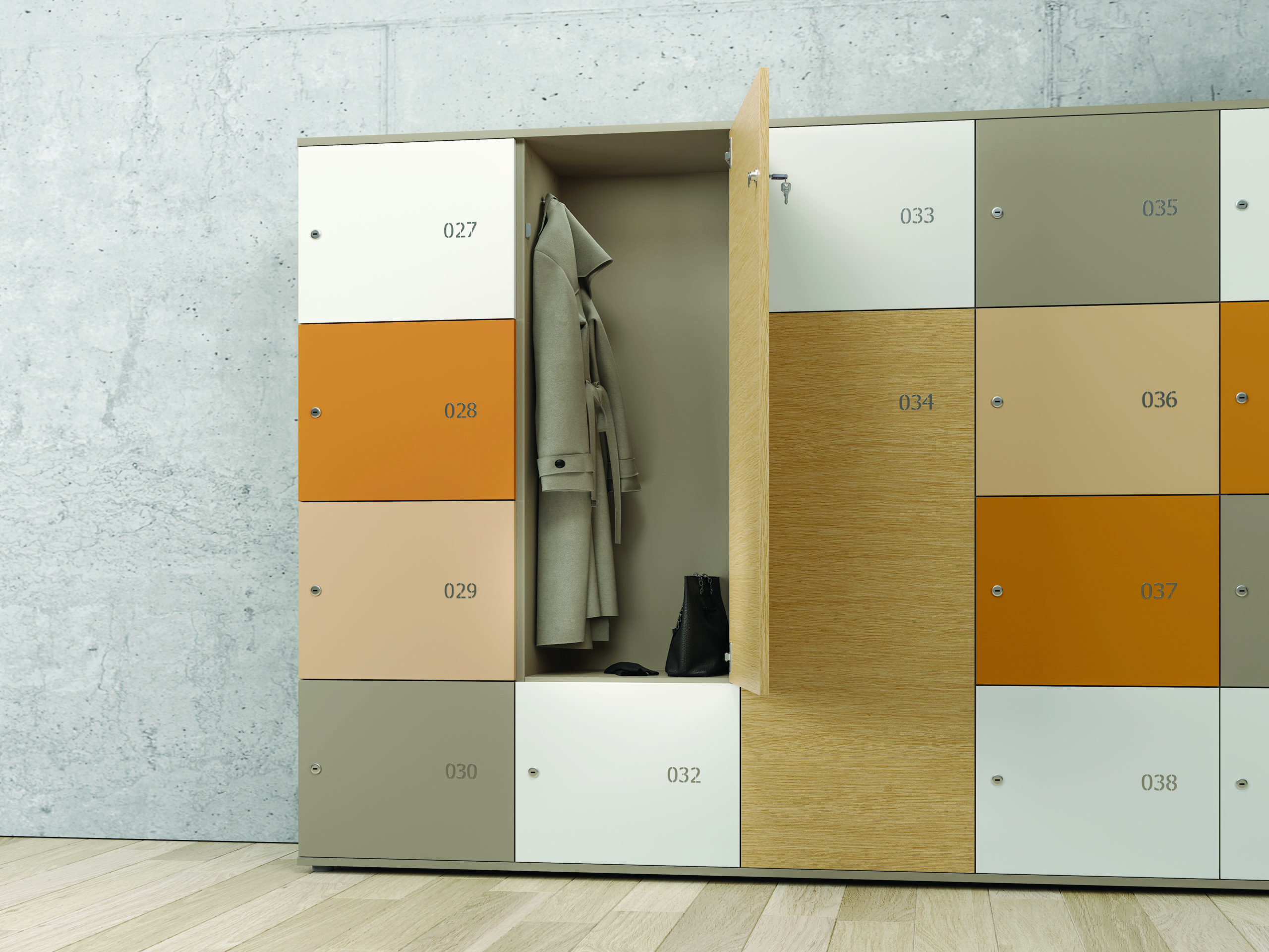 Les portes des armoires peuvent être en métal peint époxy, en mélamine ou en panneaux OSB. La numérotation sur les portes en métal est faite à l’aide d’une découpe au laser tandis que sur les
