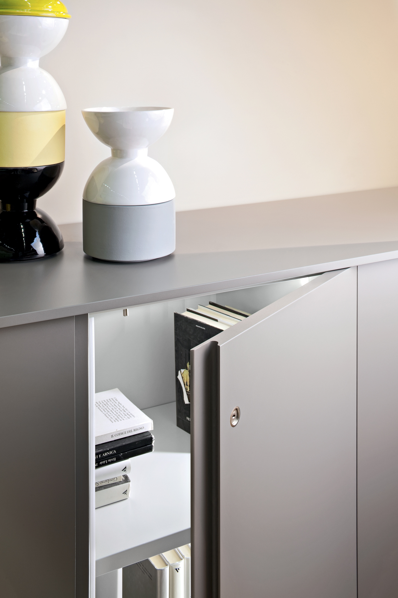 Les lignes nettes des portes peuvent être enrichies par le revêtement, à savoir par des côtés et un fond qui dépassent de 20 mm entourant ainsi l’armoire et en créant un espace à la forte personnalité.