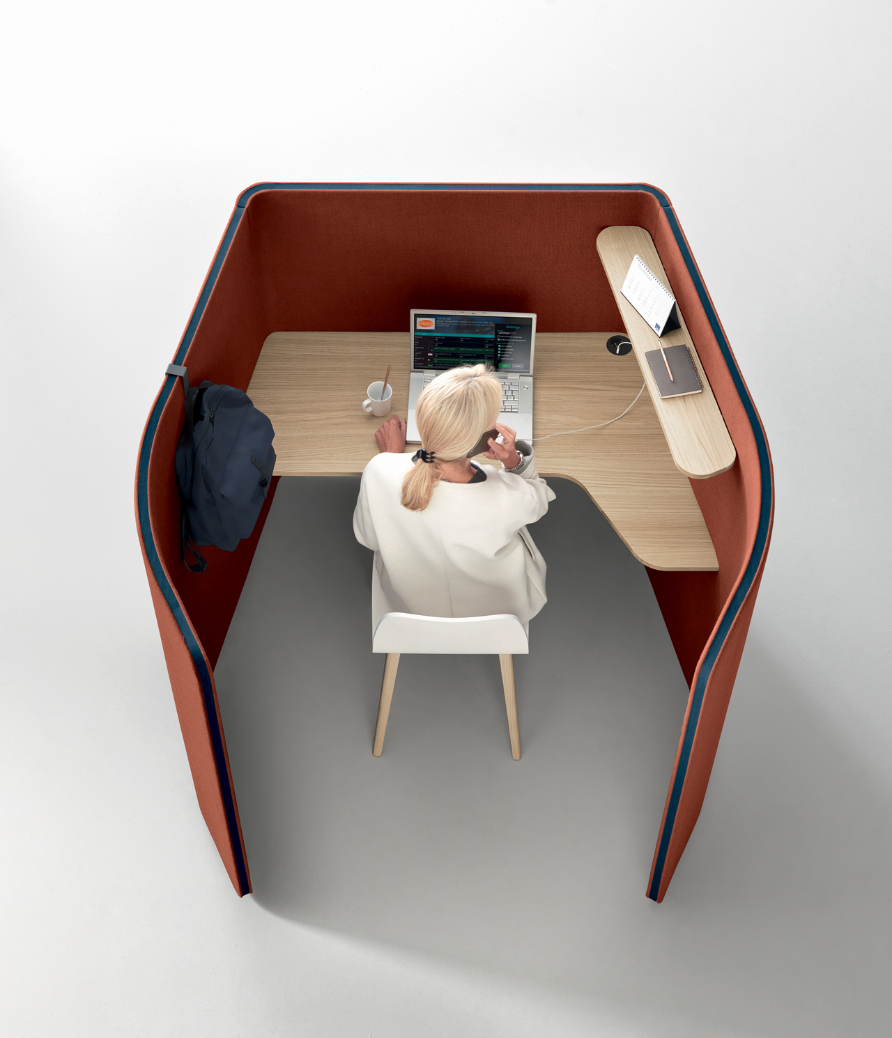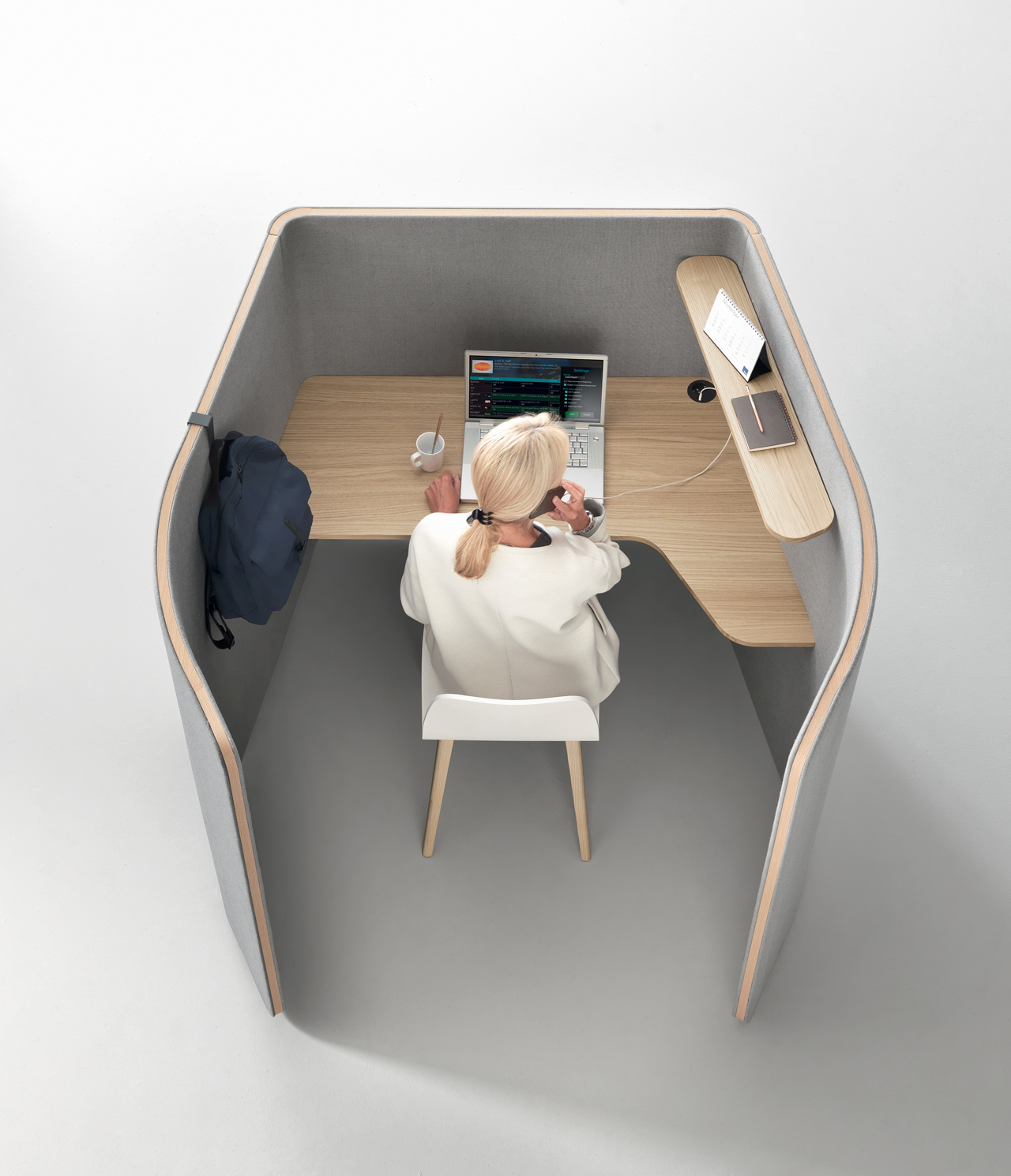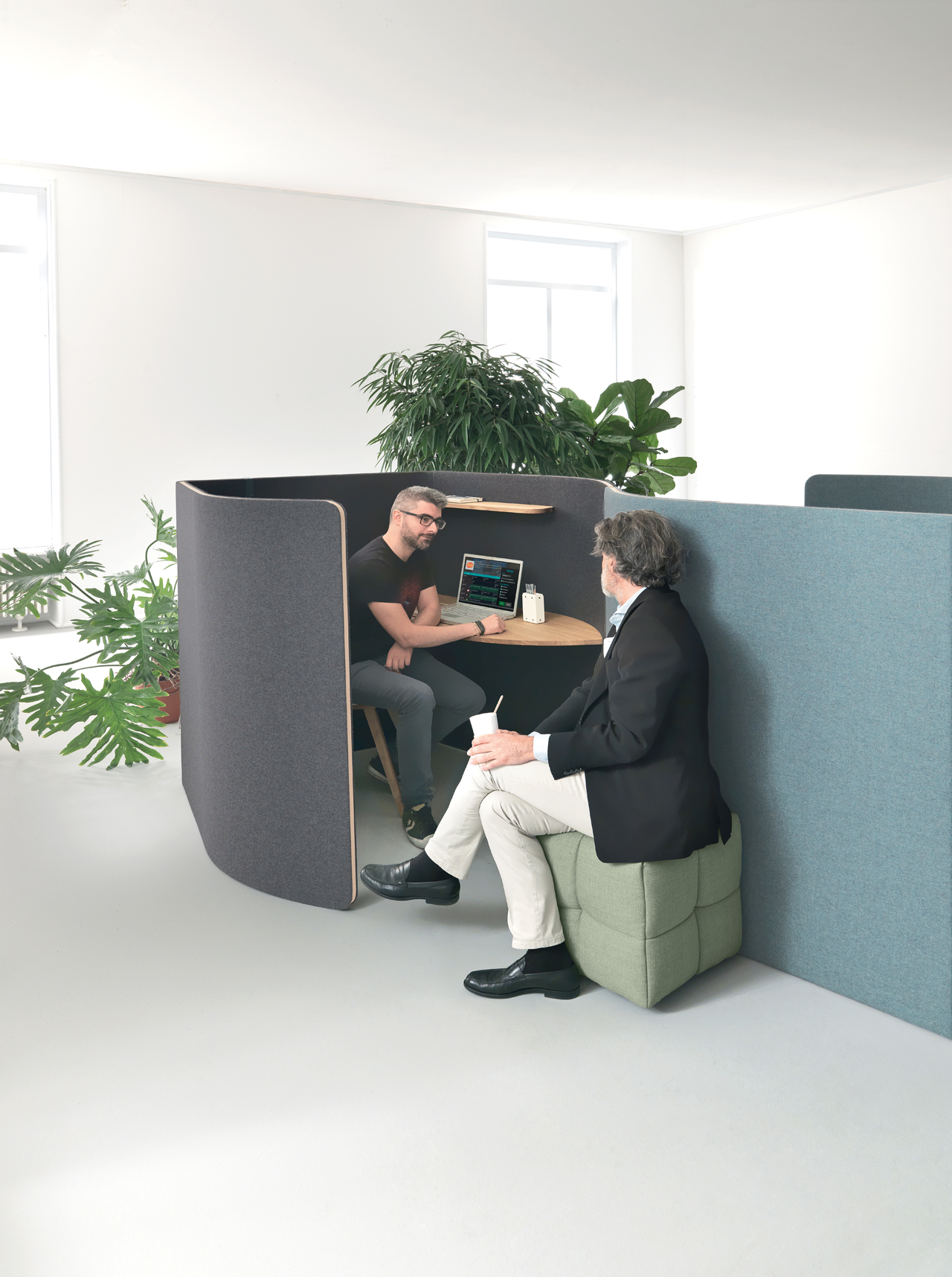 Situations modulaires de travail où trouver intimité et concentration. Les compositions peuvent être configurées dans des positions individuels, doubles ou répétées sans limites dans différentes propositions selon les besoins, les fonctions et l’espace.
