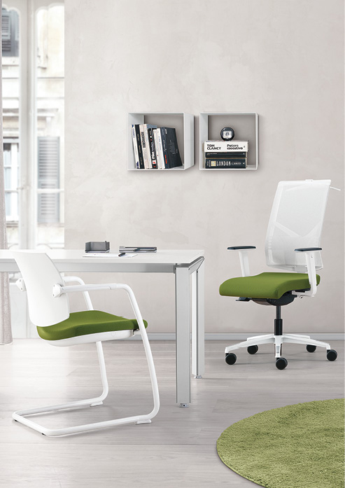 Famille de chaises de travail composée de: Sax Rete avec dossier en résille, Sax Air avec dossier muni d’une “membrane” (résille portante couplée d’un revêtement) et Sax 8, avec dossier tapissé (avec carter en plastique à l’arrière).